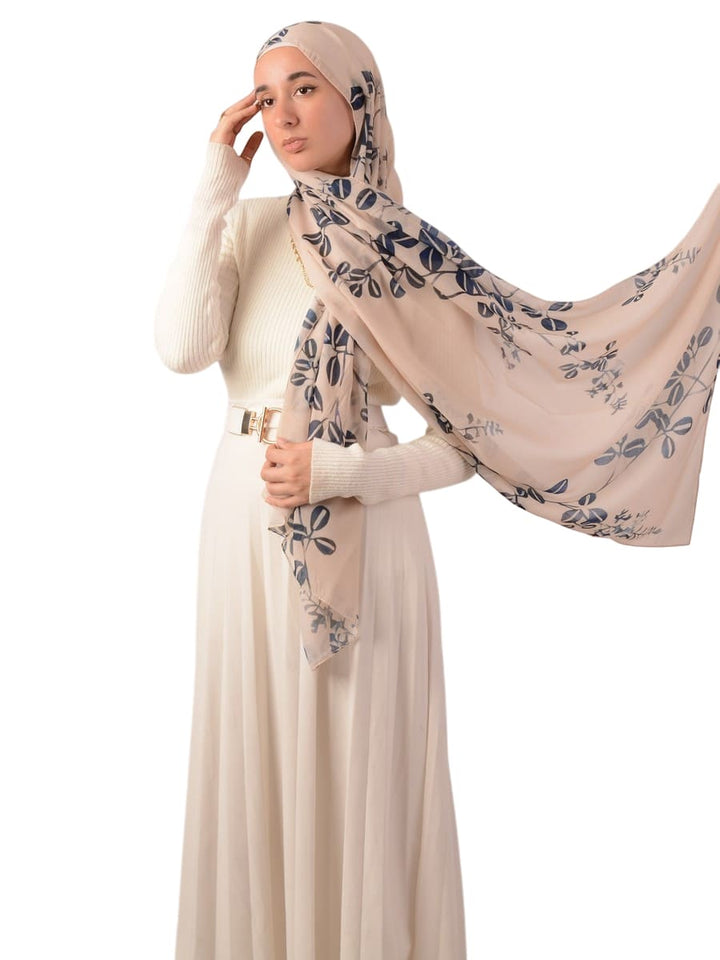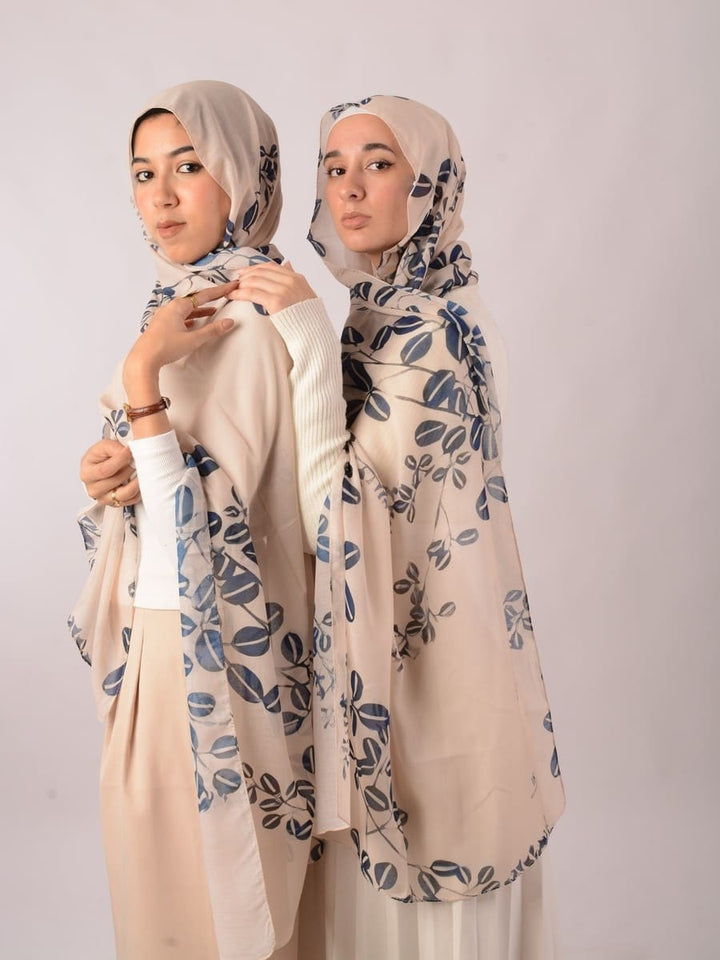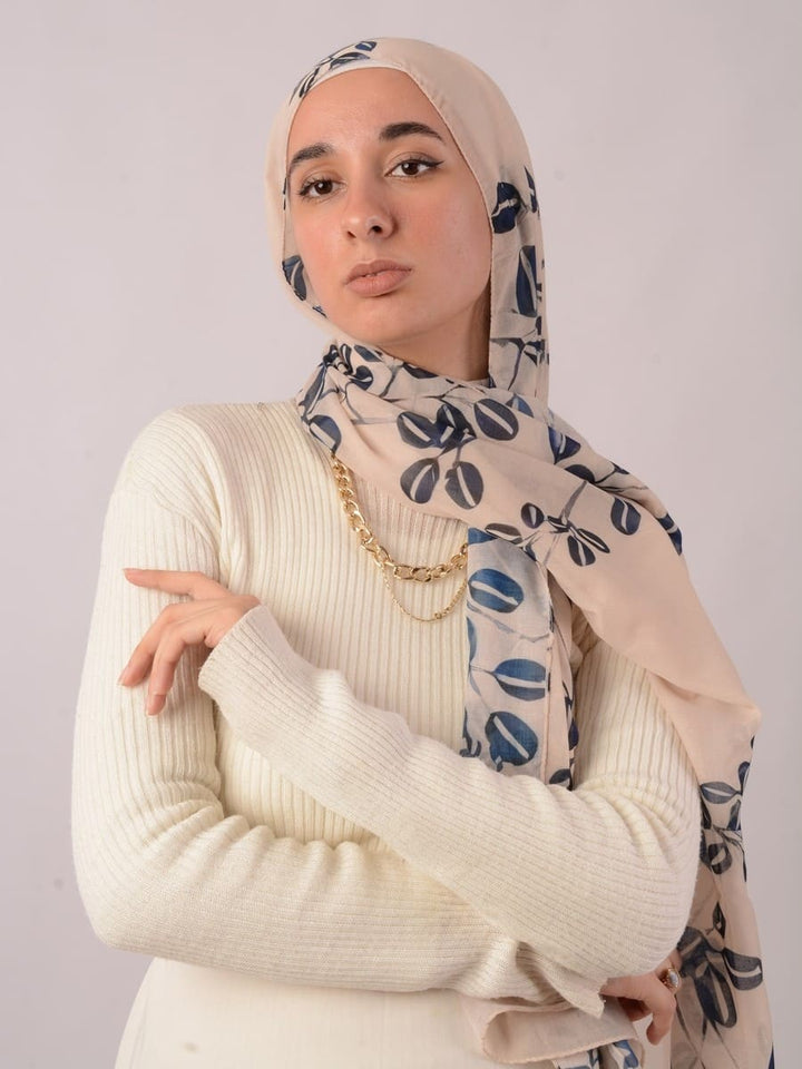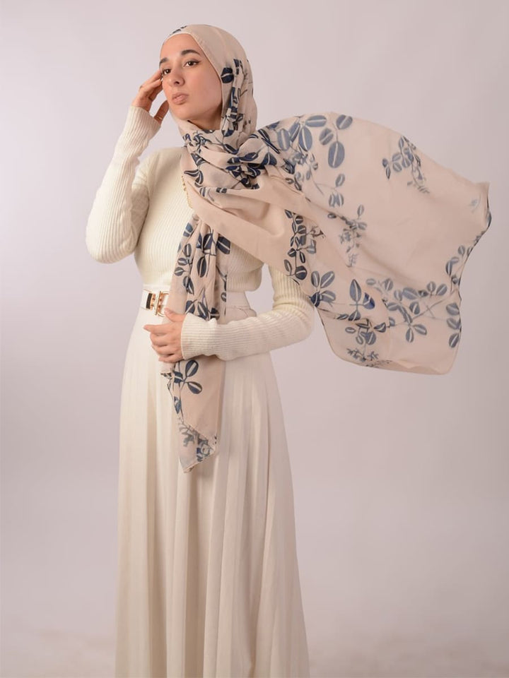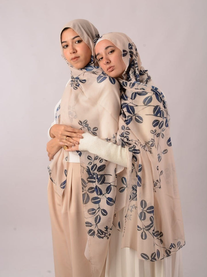 • Beige cotton scarf with blue patterns, comfort and elegance in all its simplicity.