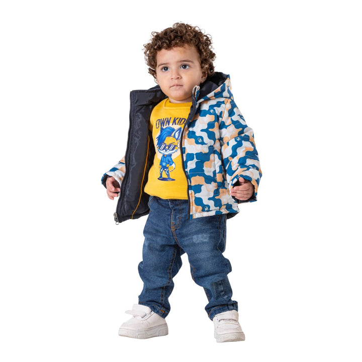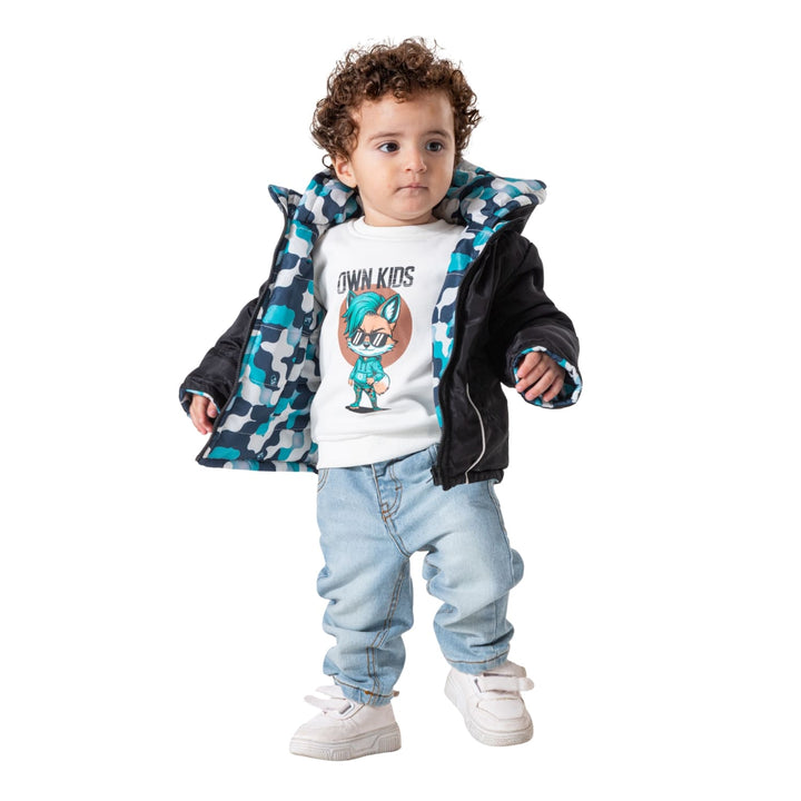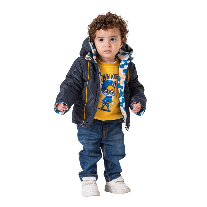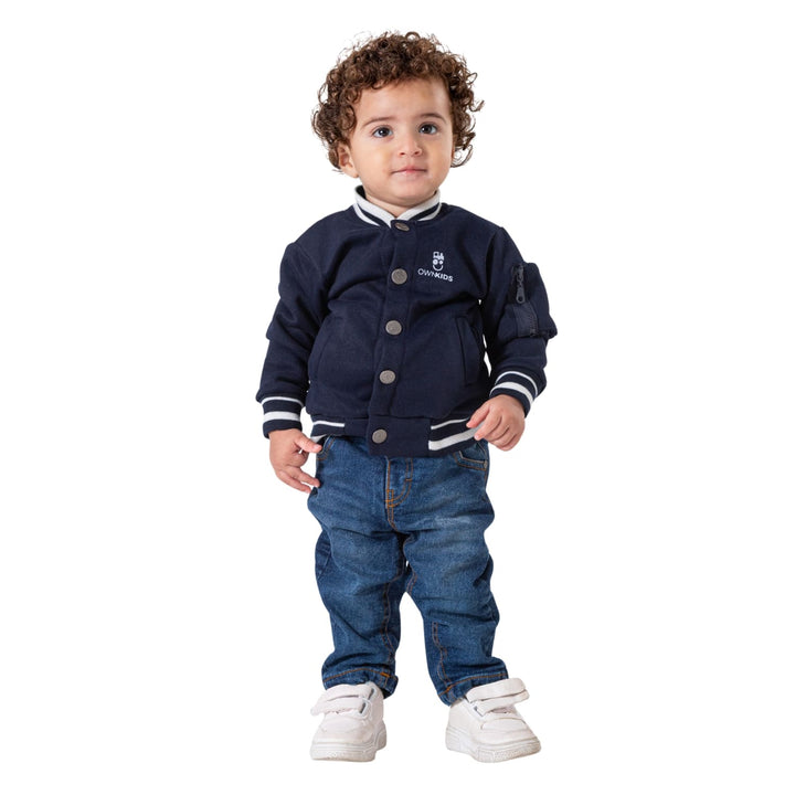 • متوفر بلونين: الدنيم لمقاسات 12–18 شهرًا و2–3 سنوات، والدنيم الفاتح لمقاس 3 سنوات.