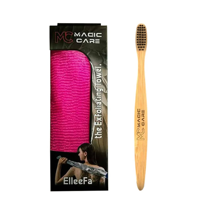 A personal care set that combines a soft toothbrush and a natural bath sponge: