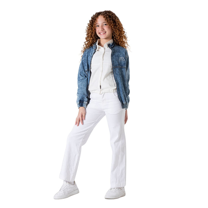 • جاكيت جينز بناتي بتصميم عصري يناسب الخروج والمدرسة.