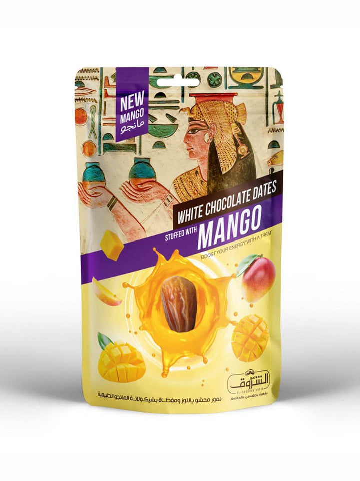- تمر مصري منزوع النوى، محشو باللوز ومغطى بالشوكولاتة بطعم المانجو الطبيعي.