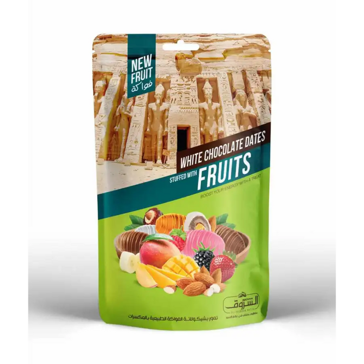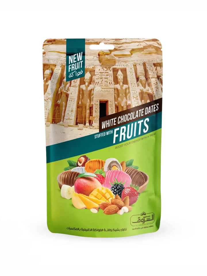 - تمر مصري منزوع النوى، محشو باللوز ومغطى بالشوكولاتة والفواكه الطبيعية،