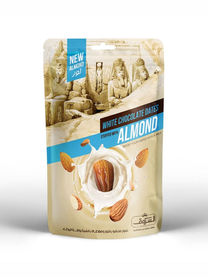 - تمر مصري منزوع النوى، محشو باللوز ومغطى بطبقة لذيذة من الشوكولاتة البيضاء .