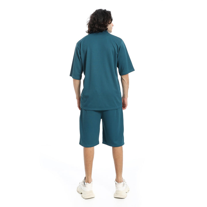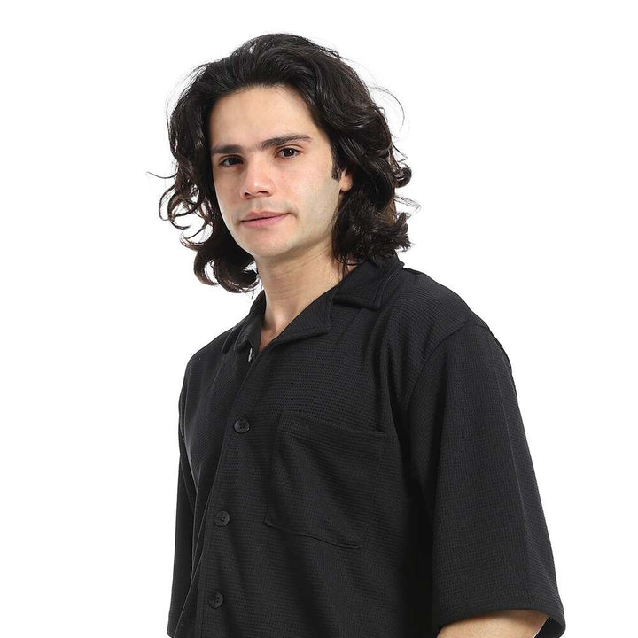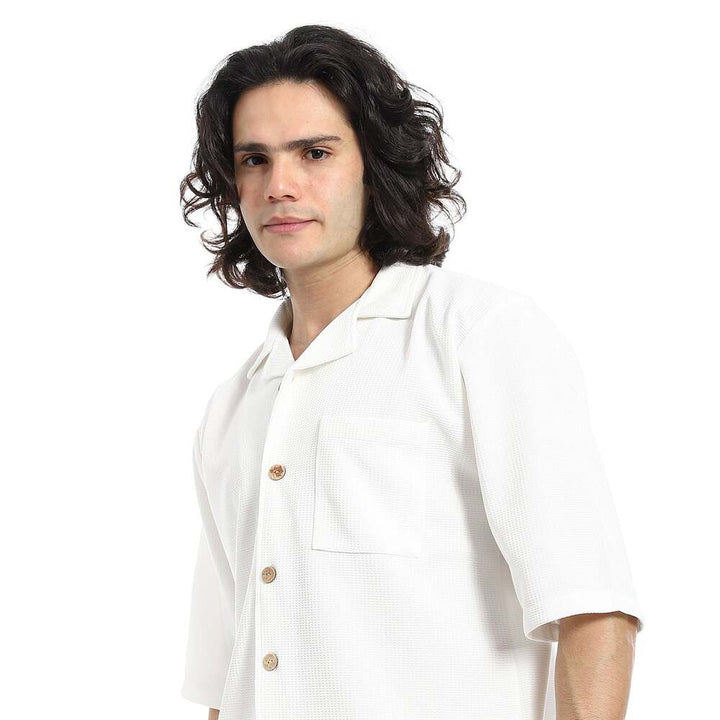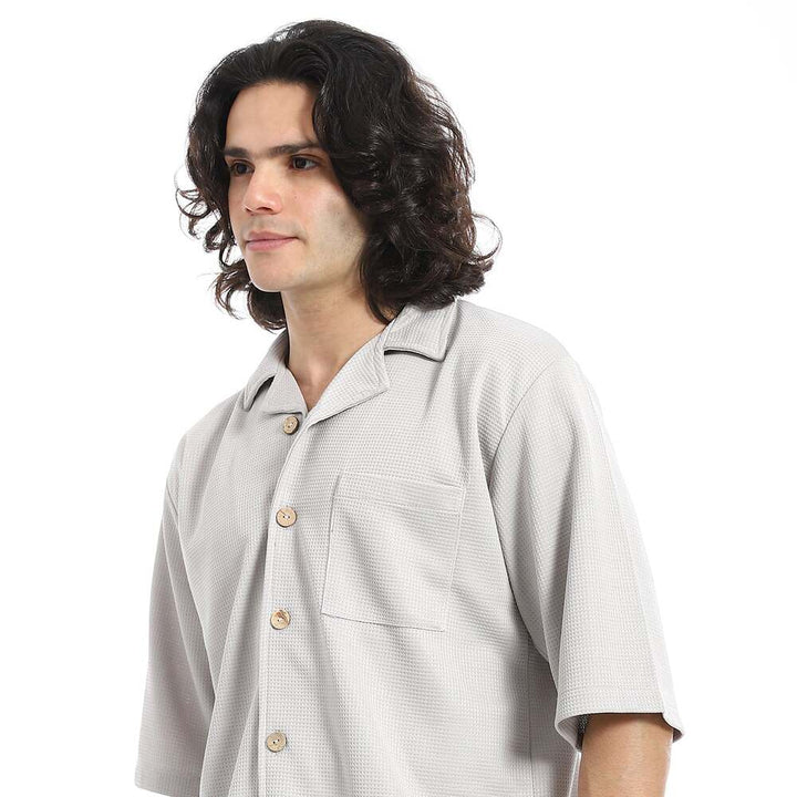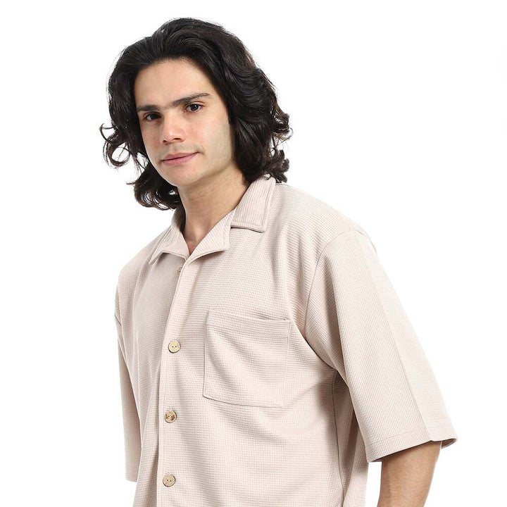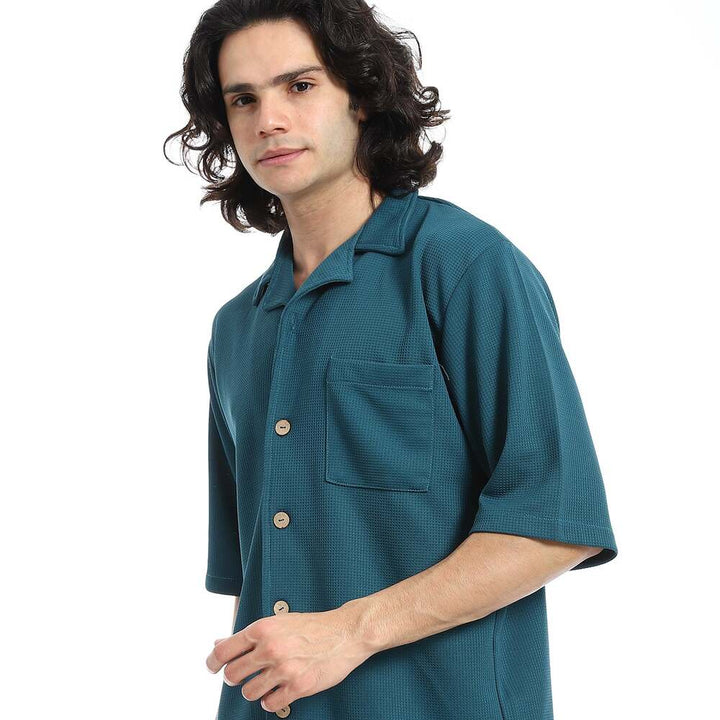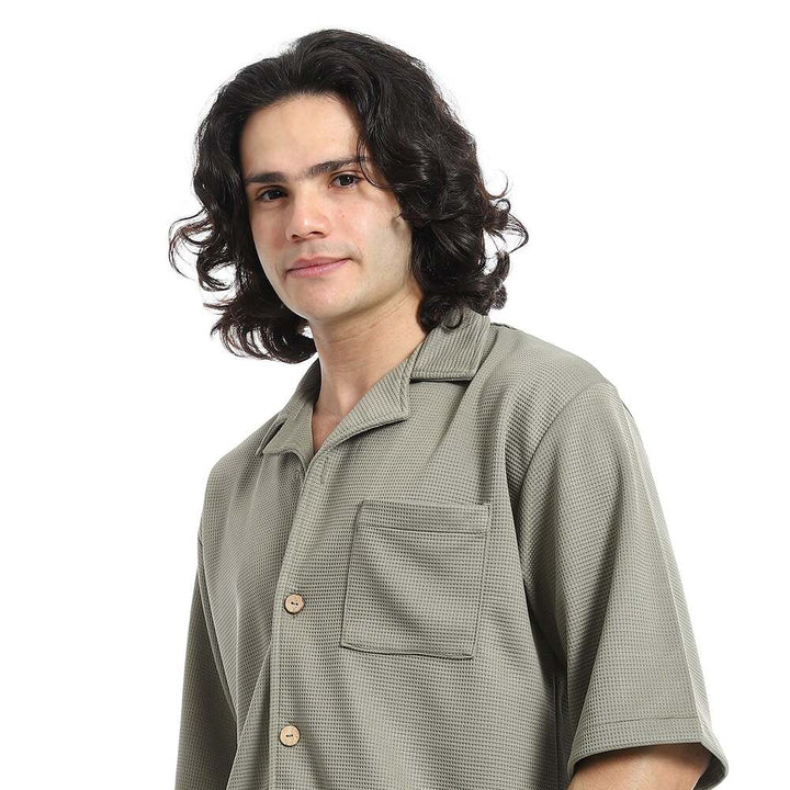 • يتميز القميص بنقشة بيكيه الراقية مع ياقة مطوية وأزار للإغلاق بأكمام قصيرة، بينما يأتي الشورت بخصر مطاطي يمنحك ثباتًا وراحة في الإرتداء.