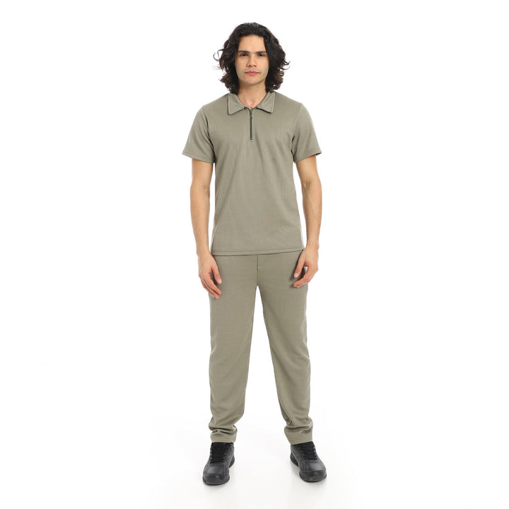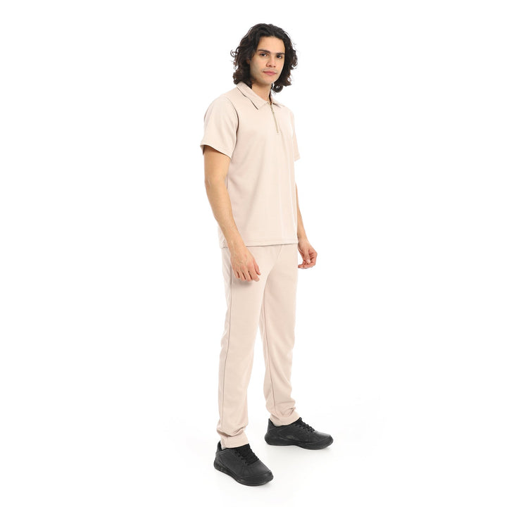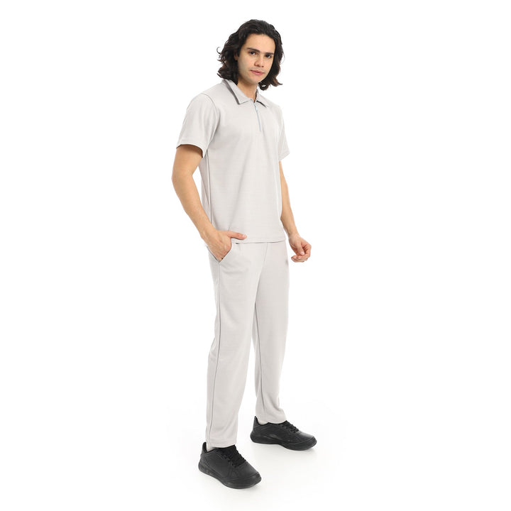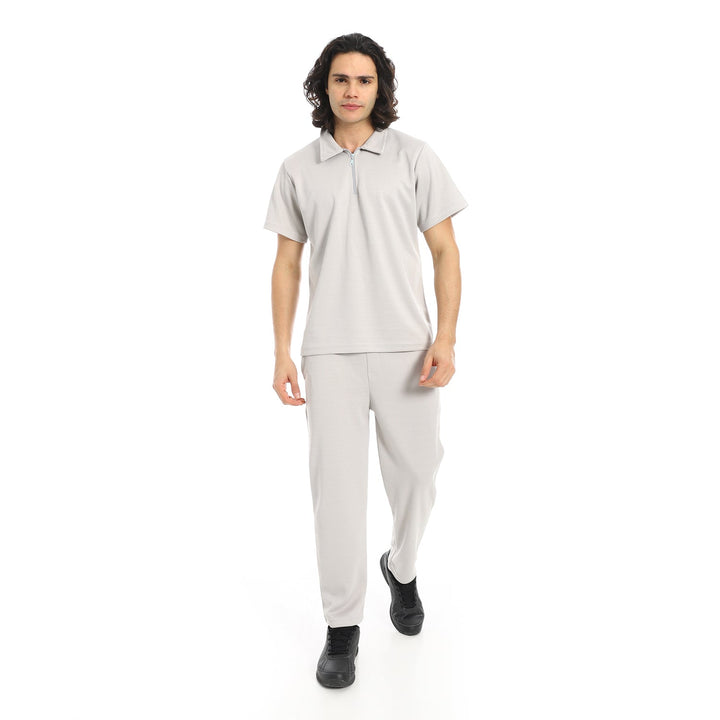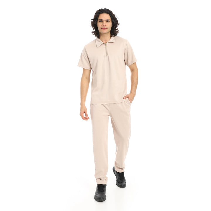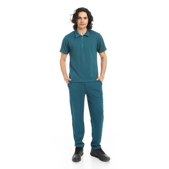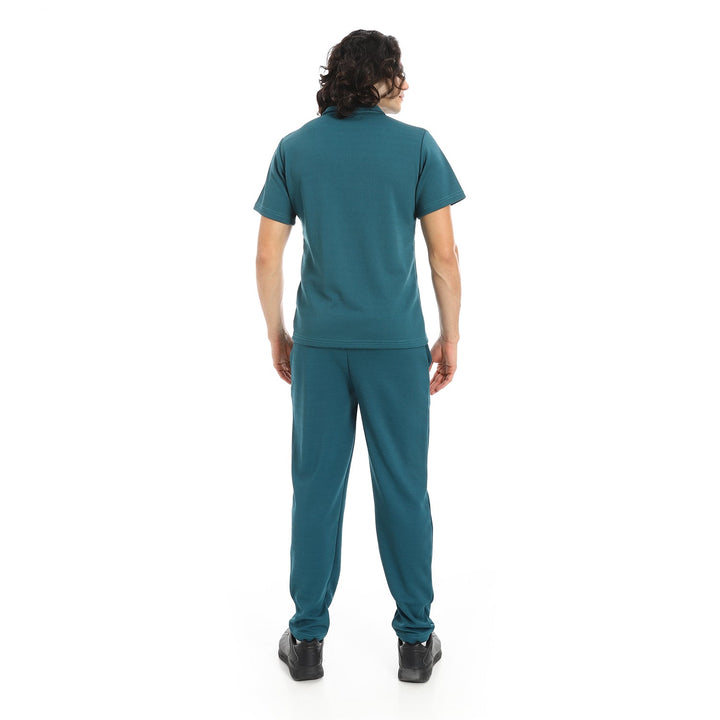 • يتميز التيشيرت بنقشة بيكيه الراقية مع ياقة مطوية وسحاب للإغلاق بأكمام قصيرة، بينما يأتي البنطال بخصر مطاطي يمنحك ثباتًا وراحة في الإرتداء.